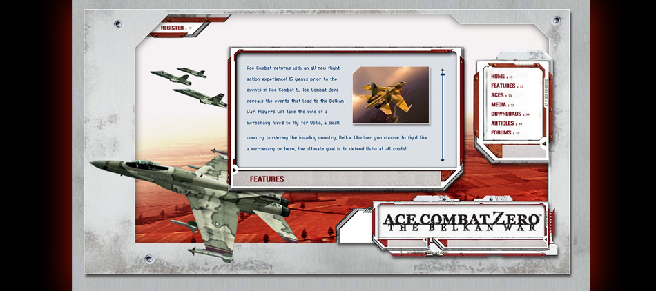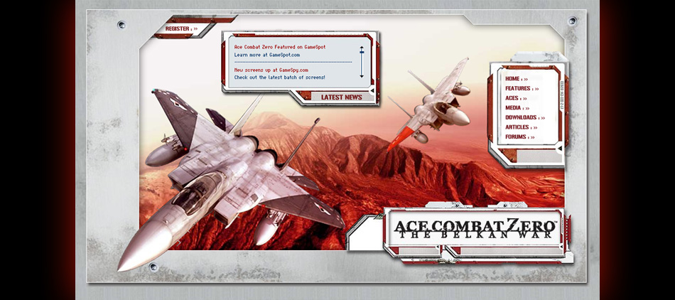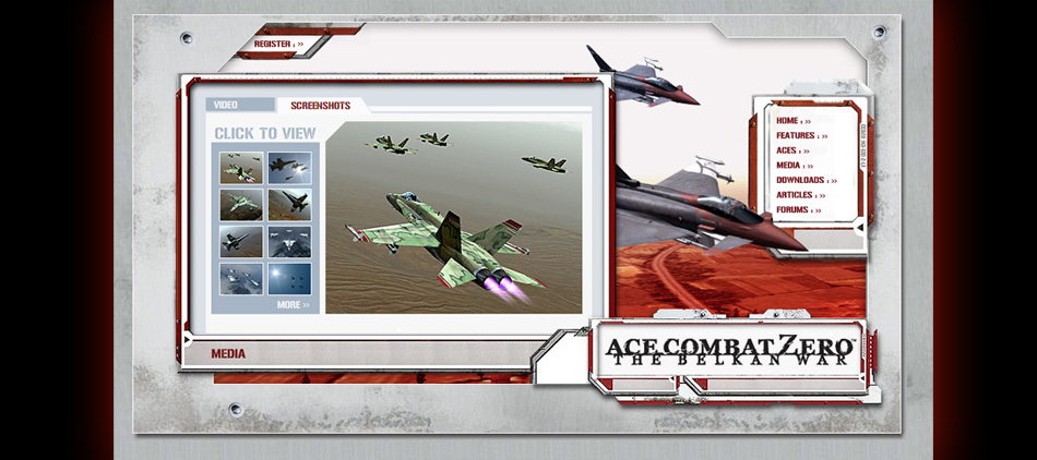The Ace Combat Zero web site was created to target a young gaming demographic and utilized 3D models created for gameplay to animate jets that fly out of the screen towards the viewer. The interface was also designed to mimic a “heads up” display configuration to reinforce the theme.