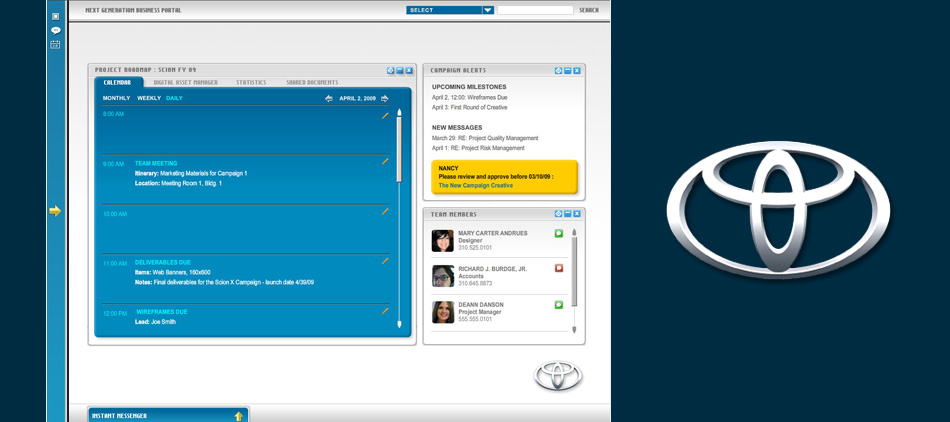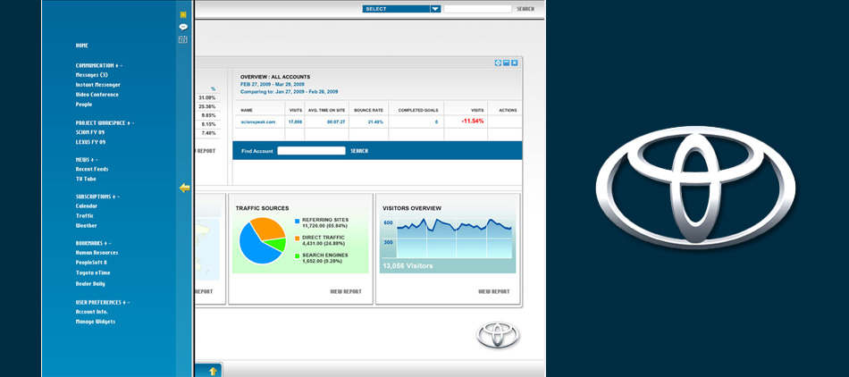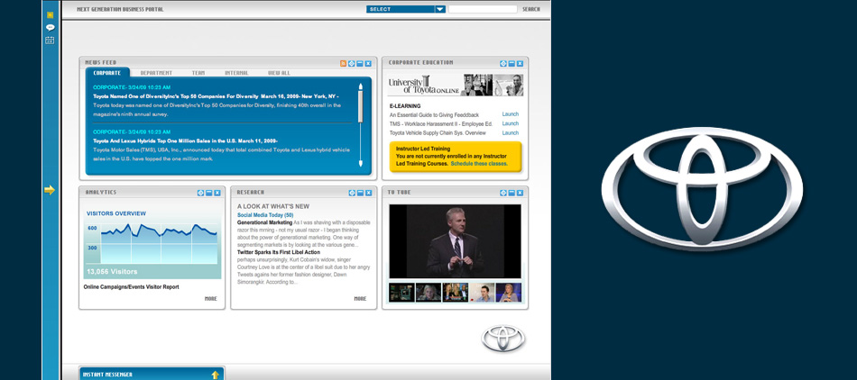 Designed as a proof of concept, the Toyota intranet portal demo was created to illustrate the benefits and possibilities available via new web technologies. Through close collaboration with Toyota, the business needs of the various departments were analyzed. The results culminated in an interactive demo that allowed the executives to evaluate and interact with the portal before a costly full development was undertaken.