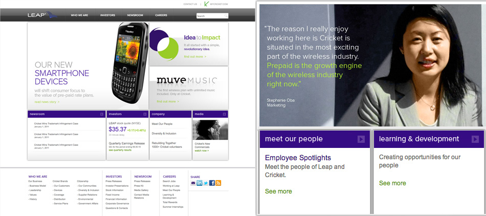 Partnering with Baker Brand, Prime8 developed the Leap Wireless International website. Realigning their business to respond to changing competitive conditions and customer needs, the company added nationwide coverage and expanded products and services to appeal to a widening group of value-seeking consumers. This website was created to share Leaps evolving story with diverse stakeholders in a more consumer-centric image and voice.