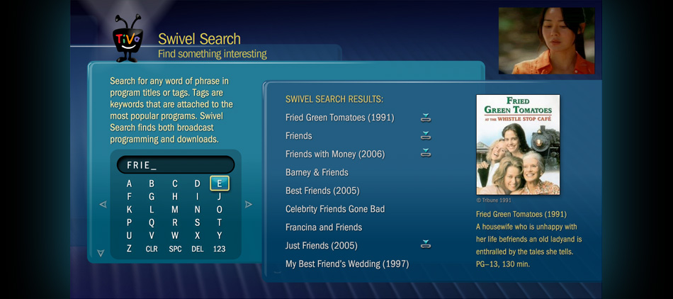 The TiVo set box demo was designed and developed as to push the boundaries of the medium. Though sliding menus and animated characters that bounced and jumped from screen to screen, an immersive experience was created. This demo was further programmed into a remote control receiver that could be given to testers to evaluate the usability of the application prior to full development on the set box platform.
